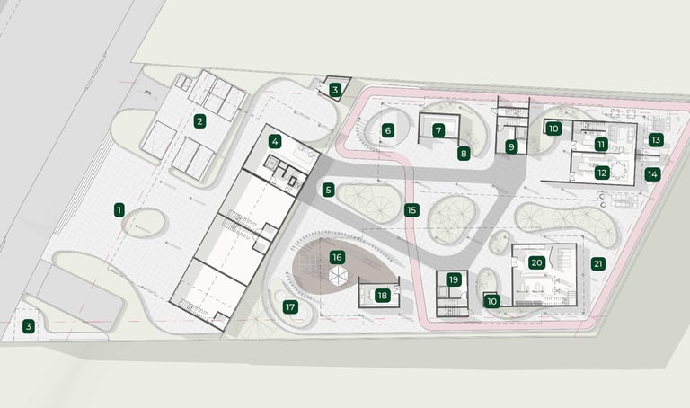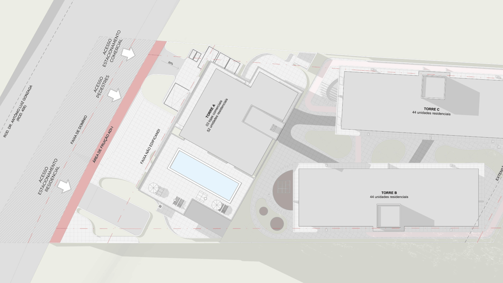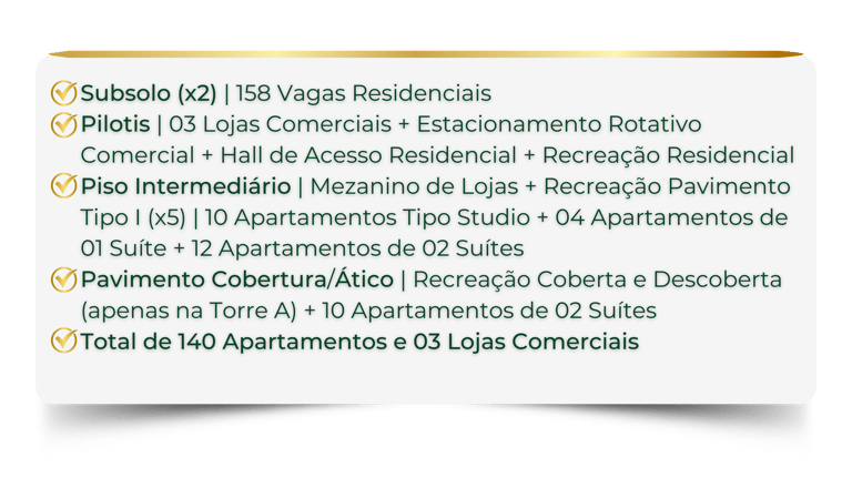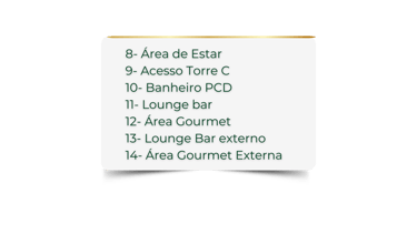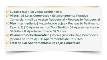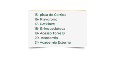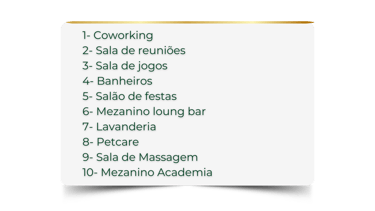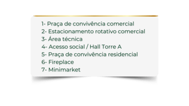 Você encontrará espaços cuidadosamente projetados para conforto, convivência e lazer. Destacam-se a Praça de Convivência Comercial e Residencial, oferecendo ambientes ideais para interação social e relaxamento. O Estacionamento Rotativo Comercial e a Área Técnica garantem praticidade e segurança. O empreendimento possui Lounge Bar, Áreas Gourmet Internas e Externas, além de Pista de Corrida, Playground, Petplace, Brinquedoteca e Academias, proporcionando uma experiência completa para todos os moradores e visitantes.