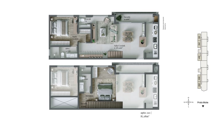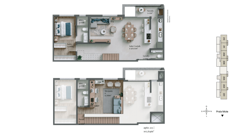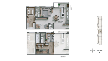 O Duplex II traz um design prático e sofisticado, com metragem variando entre 99,1m² e 102,71m². No pavimento inferior, você encontrará uma sala de estar ampla, cozinha moderna e uma suíte confortável. Subindo as escadas, outra suíte completa o layout, oferecendo conforto e privacidade. Perfeito para quem busca estilo e funcionalidade em um espaço bem distribuído.
