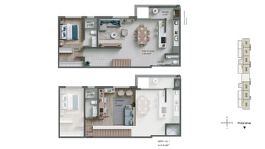 O Duplex é um estilo de apartamento distribuído em dois andares, proporcionando mais espaço, privacidade e uma organização fluida dos ambientes. Com áreas sociais no térreo e suítes no andar superior, o Duplex oferece uma experiência de moradia que une amplitude e conforto, perfeita para quem busca mais sofisticação e funcionalidade em seu lar.